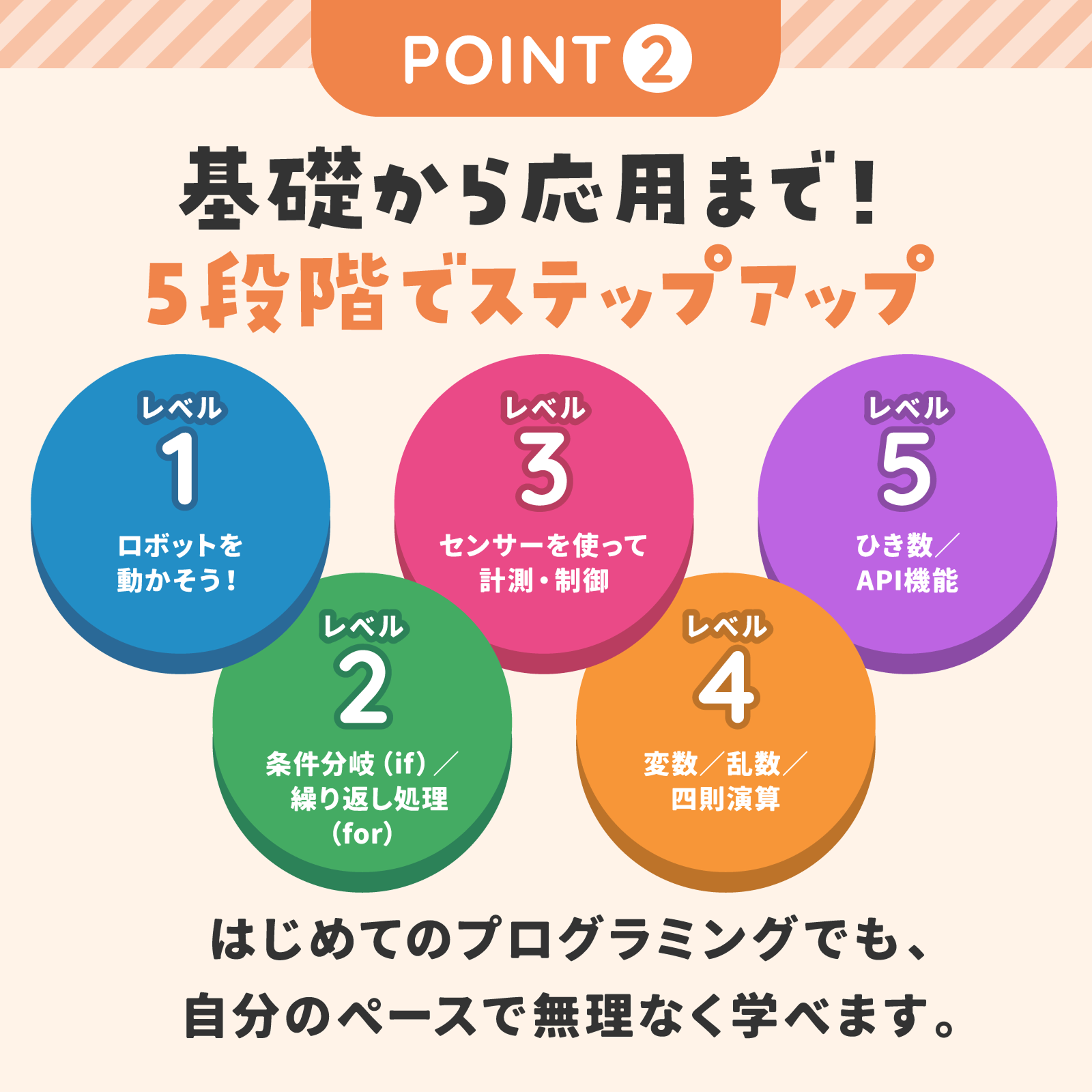 ■プログラミングのレベルは5段階に設定されており、お子様の習熟度によって少しずつ理解を深められます。